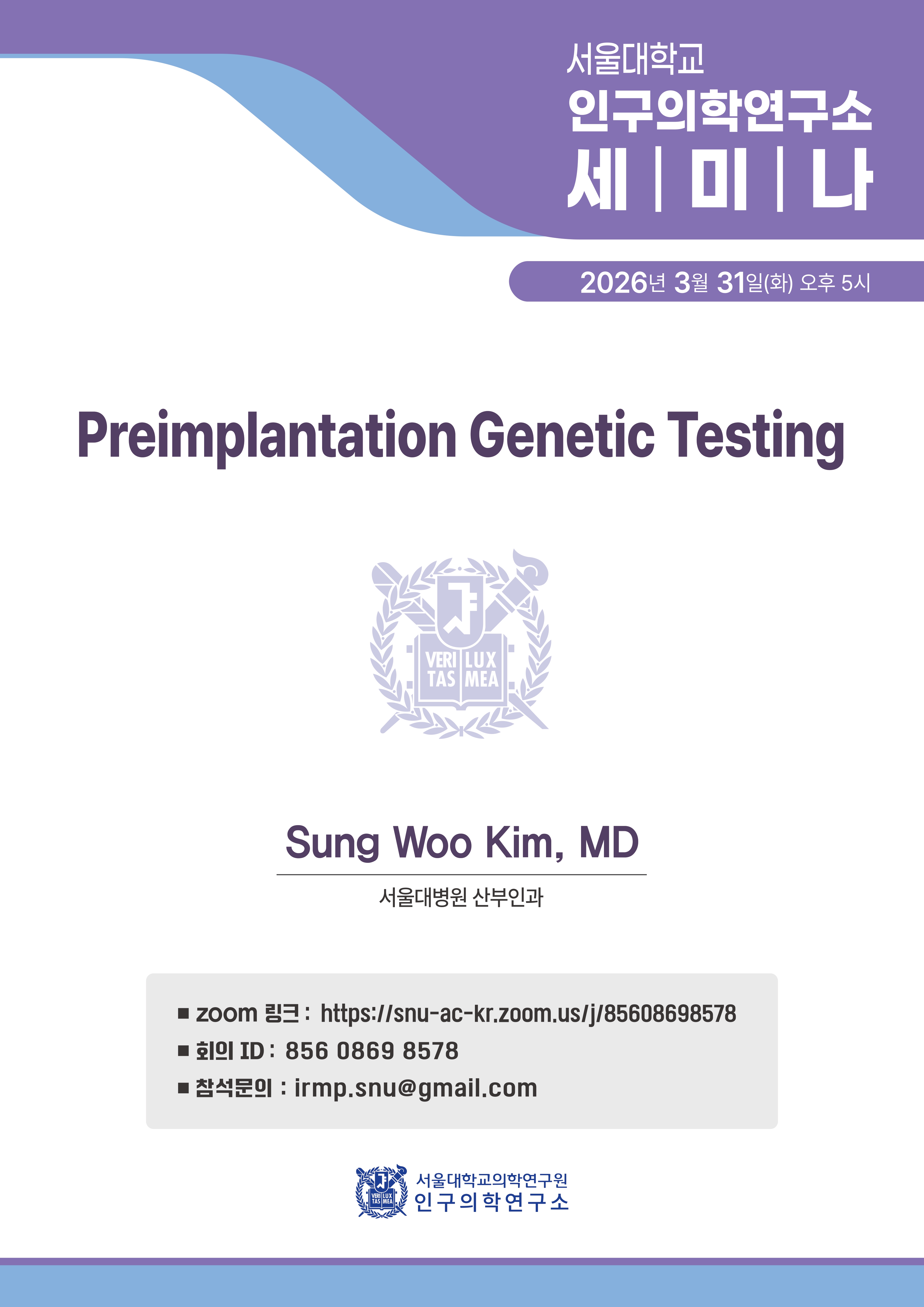 서울대학교 의학연구원 인구의학연구소에서 서울대학교병원 김성우교수님을 모시고 세미나를 개최합니다.